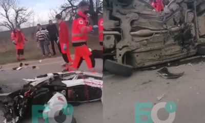 Accident de coșmar, la intrarea în Bălți. Un motociclist s-a tamponat cu o mașină. Impactul a fost atât de puternic, încât automobilul s-a inversat.