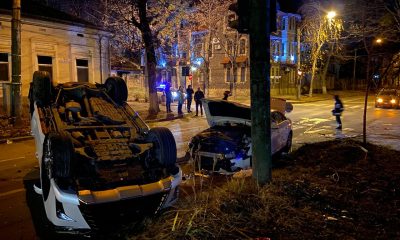 Imagini de groază, surprinse în centrul capitalei. Două mașini s-au tamponat violent, iar în rezultat una dintre ele s-a inversat pe șosea.