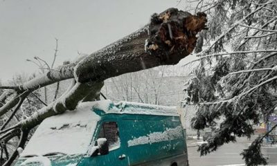 Выпало несколько сантиметров мокрого снега и в столице рухнуло первое дерево - и прямо на припаркованный микроавтобус.