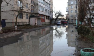 Двор одного из жилых домов в столице залило водой в результате прорыва водопровода.