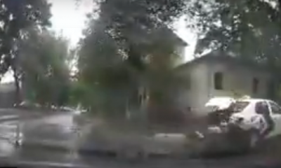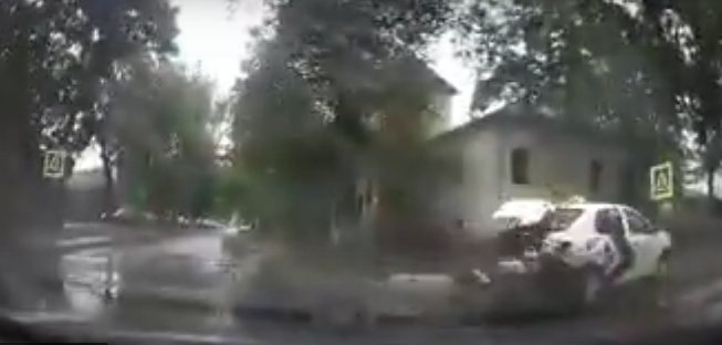 Сильное столкновение такси и легкового автомобиля. Авария произошла 27 мая в центре столицы, на перекрестке улиц Болгарской и А. Бернардацци.