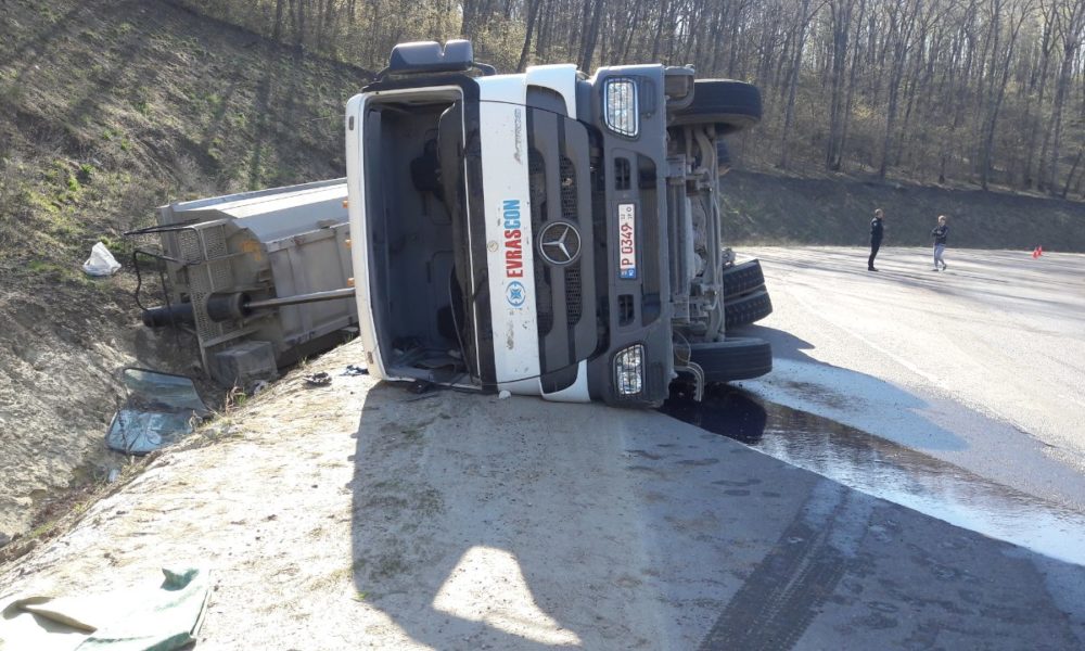 Un camion încărcat cu prundiș s-a răsturnat lângă Rusca. Șoferul a ajuns la spital.