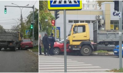 O basculantă și un autoturism de model Opel Omega nu au putu împărți banda de acces spre strada Vasile Alecsandri la intersecția cu strada Romană.