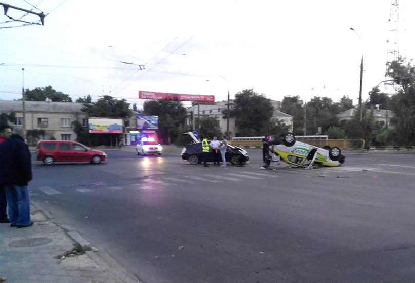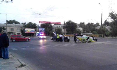 Grav accident în Chișinău. O mașină care aparține unei firme de taxi s-a răsturnat după ce s-a tamponat cu un alt autoturism.