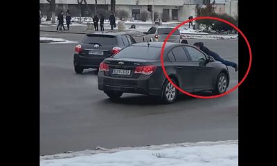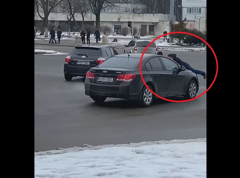 Doi tineri au fost filmați cum se plimbă pe capota unei mașini.