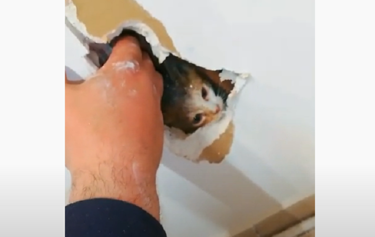 Un motănaș, rămas blocat între pereții unui supermarket și a unui bloc locativ a fost eliberat cu succes de salvatori.