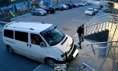 Ghinion pentru un șofer de la noi. Acesta a uitat să tragă frâna de mână, iar microbuzul său a distrus balustrada unei scări.