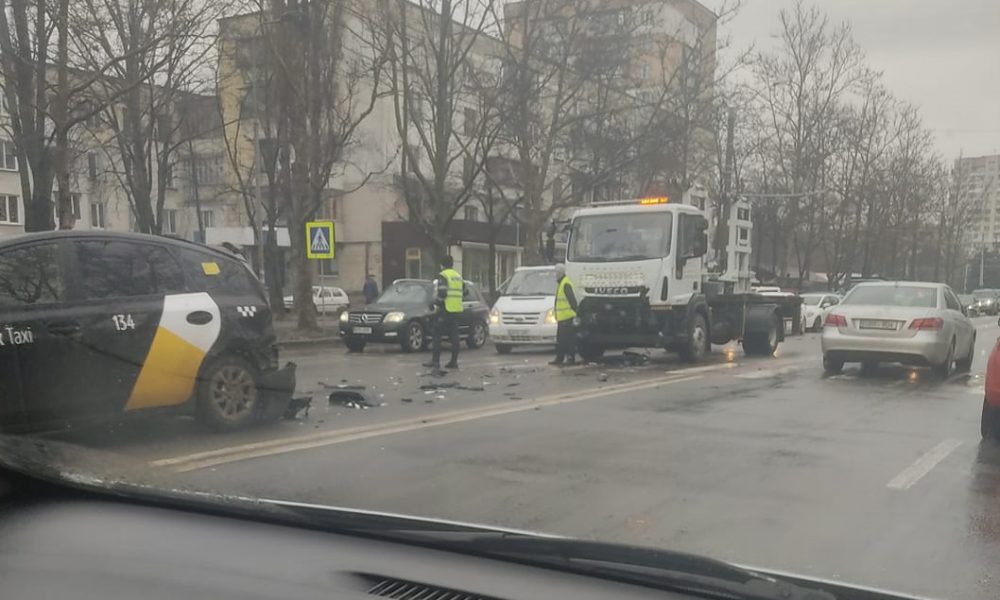 Accident violent în sectorul Buiucani al capitalei. Un taxi s-a pomenit cu portiere portbagajului boțită rău după ce a fost accidentat în partea din spate de...