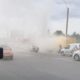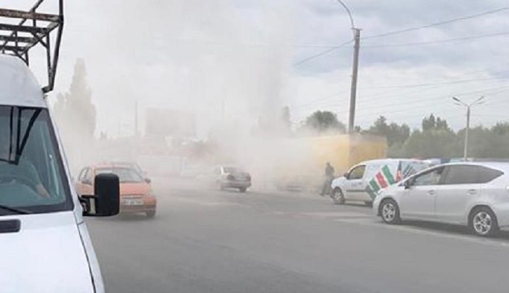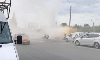 O mașină, învăluită de fum pe o stradă din Capitală.