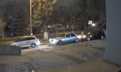 Momentul în care un șofer, ajutat de o femeie, se izbește într-o altă mașină, în timp ce parchează.