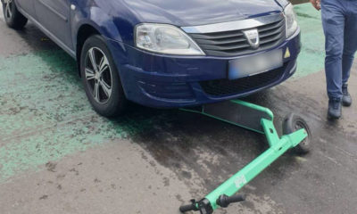 O trotinetă a ajuns sub roțile unui automobil de model Dacia.