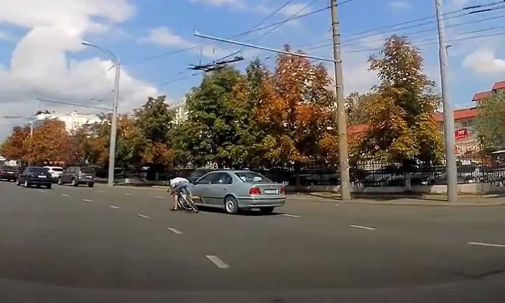 Un biciclist a fost la un pas de a ajunge sub roțile unei mașini în plin trafic. Norocul lui a fost ca șoferul să nu aibă...