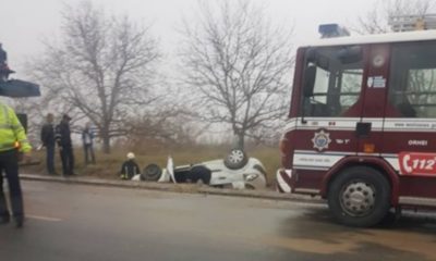O mașină a derapat și s-a răsturnat într-un șanț de pe marginea drumului.