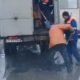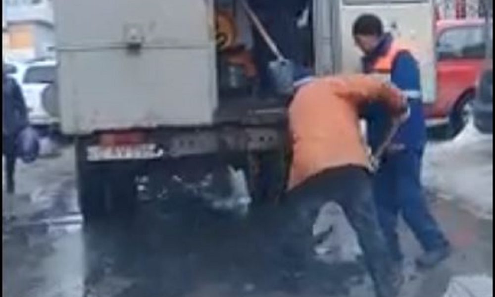Momentul în care mai mulți muncitori repară un drum. Aceștia pun asfaltul direct în gropile pline cu apă și noroi.