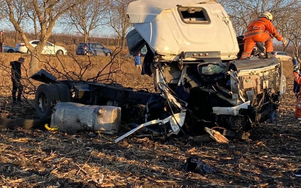 Un camion a fost făcut zob după ce a derapat de pe traseu și s-a răsturnat.