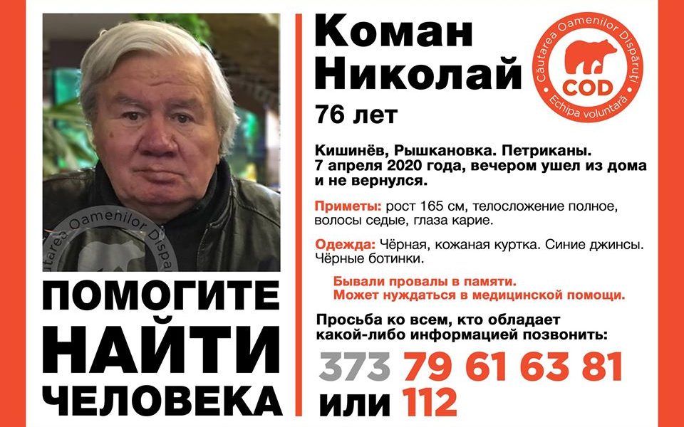 76-летний житель Кишинёва Николай Коман пропал более недели назад.