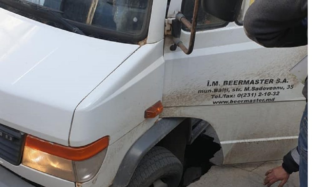 Roata unui microbuz a fost înghițită la propriu de asfalt. Pe o rețea de socializare au apărut imagini de la locul incidentului.