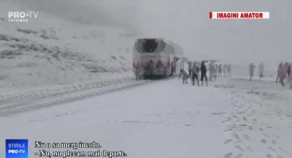 Un autocar plin cu moldoveni nu a mai putut înainta. Oamenii și-au făcut câteva poze în zăpadă și s-au întors acasă, în Republica Moldova.