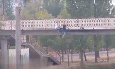 Doi adolescenți filmați în timp ce atârnau pe un pod ce trece peste calea ferată, în regiunea transnistreană.