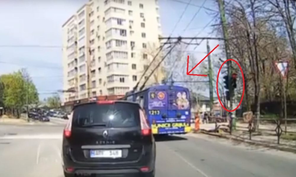 Un troleibuz plin cu pasageri a fost surprins cum trece la culoarea roșie a semaforului.