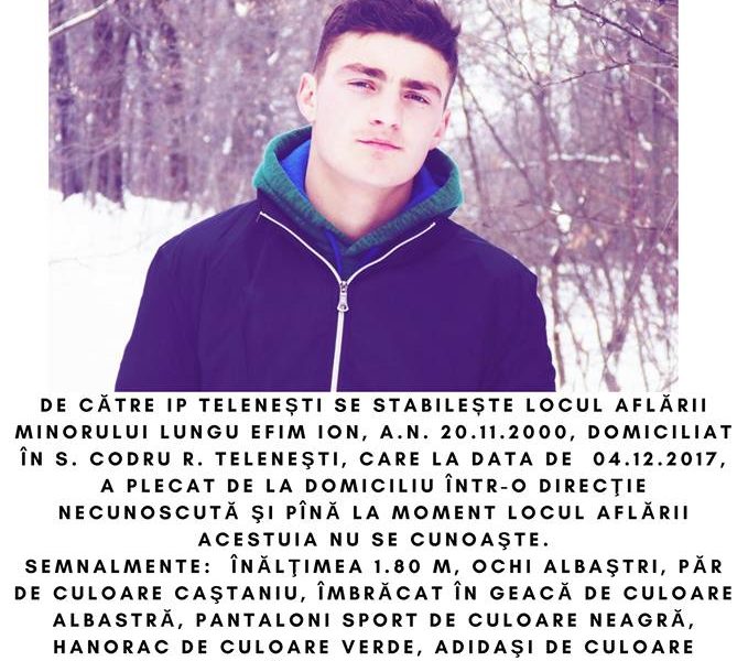 UN MINOR DIN TELENEȘTI A PLECAT DE ACASĂ ȘI NU S-A MAI ÎNTORS