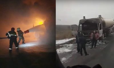 Imagini noi cu autocamionul distrus de flăcări.